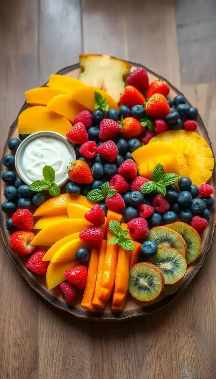 - Arrange the strawberries, blueberries, sliced kiwis, and mangoes artfully on a large platter.