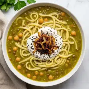 - Ladle the Ash Reshteh into bowls and garnish with fried crispy onions, fried dried mint, and an extra dollop of kashk or yogurt if desired. Enjoy this classic Persian comfort food!