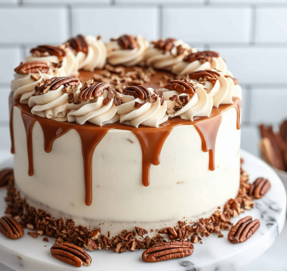 Press the reserved toasted pecan halves around the bottom border of the cake and create a cluster on top. For a glossy finish, you can drizzle the cake with a simple caramel sauce just before serving. Allow your assembled Butter Pecan Cake to sit at room temperature for about an hour before slicing; this lets the frosting soften slightly for the perfect bite.