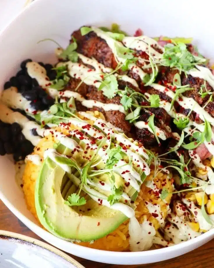 You can easily change up this recipe by using chicken or tofu instead of steak. For a vegetarian version, swap the steak for roasted vegetables or more beans. Adding different grains like quinoa or brown rice can also change the dish’s texture.