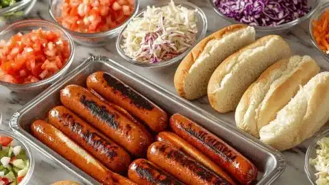 If you have leftovers, store the hot dogs in an airtight container in the refrigerator. The same goes for any toppings that can be kept, like sauerkraut, coleslaw, and sauces. Make sure to keep buns wrapped to avoid them getting stale. Consume leftovers within 3-4 days for the best quality.