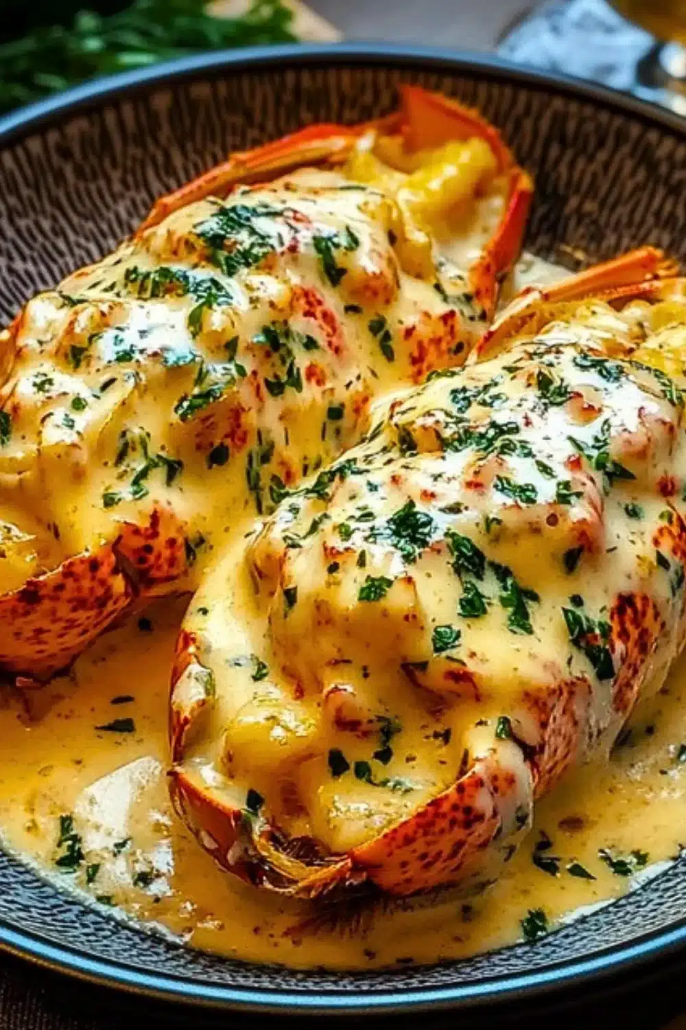 Serve this dish hot, straight from the oven. Place the stuffed lobster shells on individual plates, and add a lemon wedge for a splash of freshness. This dish pairs well with a crisp green salad and a glass of white wine.