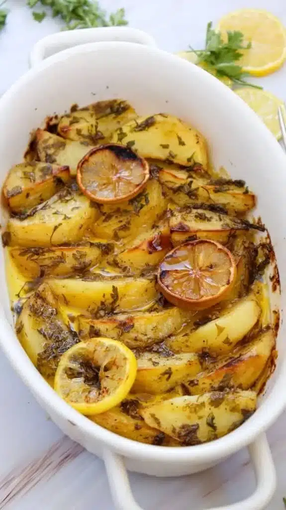 Serve Greek Lemon Potatoes warm as a side dish. They pair well with grilled chicken, fish, or lamb. You can also enjoy them on their own or topped with more fresh parsley for added color.