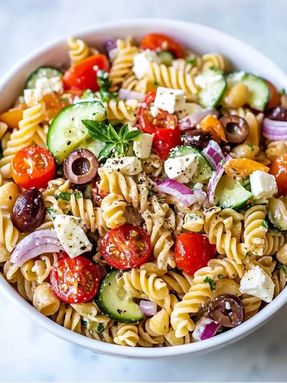 The foundation of this vibrant dish includes cooked pasta, juicy tomatoes, crisp cucumbers, red onions, bell peppers, olives, and crumbly feta cheese. Ensure all your vegetables are fresh for the best flavors.