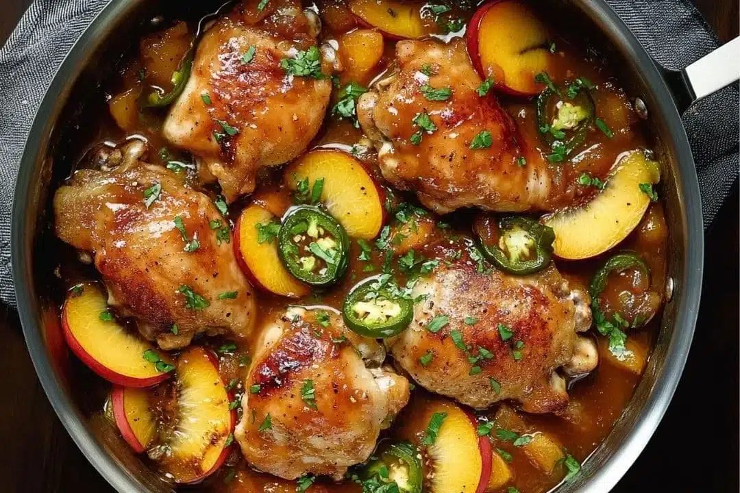 In the same skillet, raise the heat back to medium and add the sliced jalapeños. Sauté for 3 minutes. Add the sliced peaches and cook for another 3 minutes, stirring occasionally, until softened.Glaze & Finish the Chicken