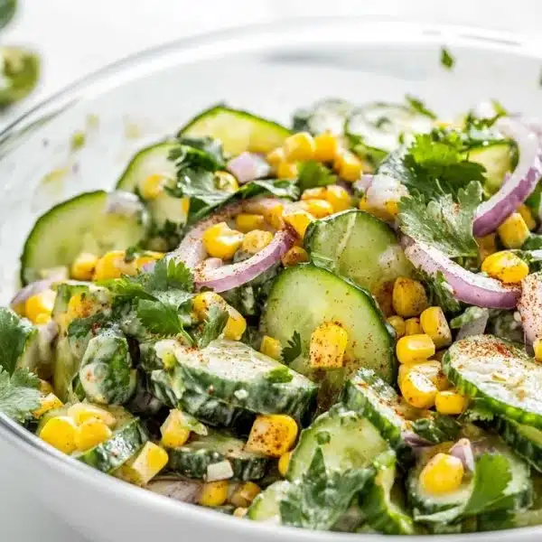 A refreshing and flavorful Mexican Cucumber Salad perfect for warm days or gatherings, combining crisp cucumbers, sweet corn, and zesty dressing.