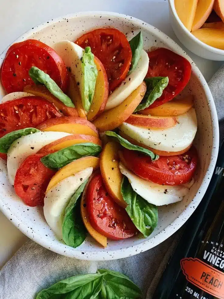 A delightful summer salad that combines ripe peaches, creamy mozzarella, and fresh basil, drizzled with balsamic glaze and olive oil, perfect for gatherings or a light dinner.