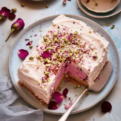 Rose & Pistachio Milk Cake is a delightful dessert that brings together the rich flavors of rose and the crunchy texture of pistachios. This cake is not only visually stunning but also incredibly moist and delicious. Its unique taste makes it perfect for special occasions, or simply to enjoy a sweet treat at home. Plus, the combination of the fragrant rose syrup and the nutty pistachios makes this cake a standout dessert.
