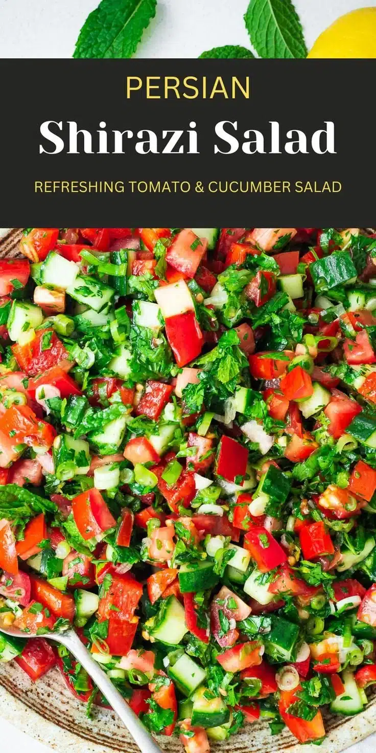 Shirazi Salad is best served fresh. You can enjoy it as a side dish with grilled meats or use it as a topping for wraps and sandwiches. It’s also delicious on its own as a light meal. If you want, you can garnish it with fresh herbs like parsley or mint for extra flavor.