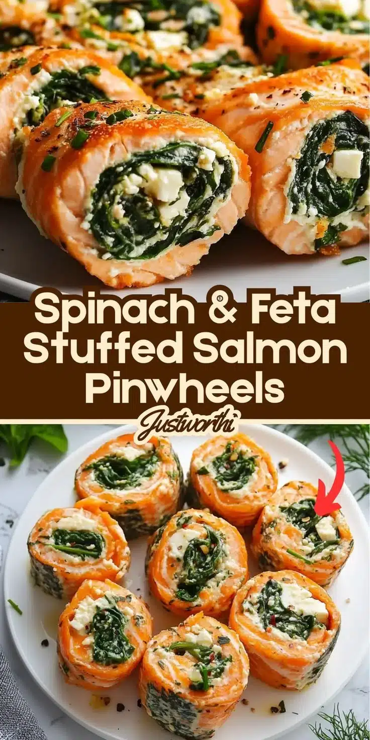 Serve your Spinach & Feta Stuffed Salmon Pinwheels on a large platter for a beautiful presentation. Pair them with roasted vegetables, such as asparagus or broccoli, or a fresh side salad to complete the meal. A squeeze of lemon over the top can add an extra burst of flavor.