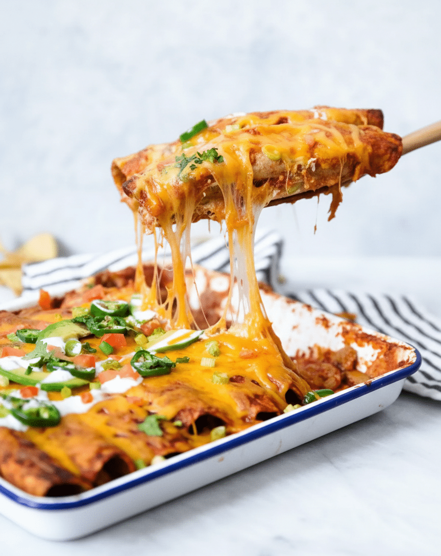 Serve these enchiladas hot from the oven for the best taste. You can top them with diced onions, sliced black olives, a dollop of sour cream, or fresh cilantro for added flavor. They pair well with rice, beans, or a simple salad on the side for a complete meal.