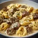 A comforting dish combining rich flavors of steak, creamy sauce, and cheesy tortellini, perfect for weeknight dinners or special occasions.